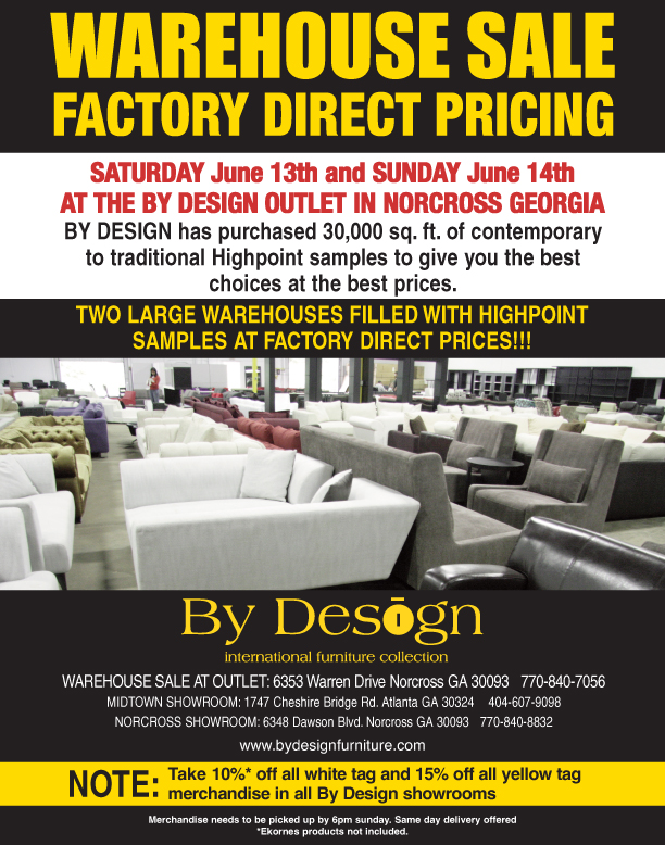 The By Design Outlet in Norcross, GA (6353 Warren Drive – Norcross) has two large warehouses filled with Highpoint samples at factory direct prices! Check out 30,000 sq. ft. of deals Saturday, June 13, and Sunday, June 14.