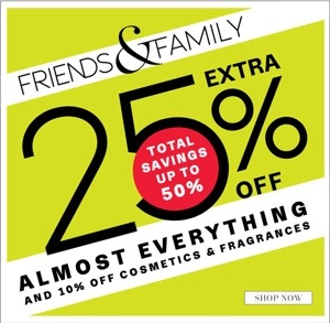Lord & Taylor Friends & Family sale in-store (for those who live near a store) and online through Monday, April 21st. Almost all regular and sale merchandise will be an extra 25% off, with 10% off cosmetics and fragrances.