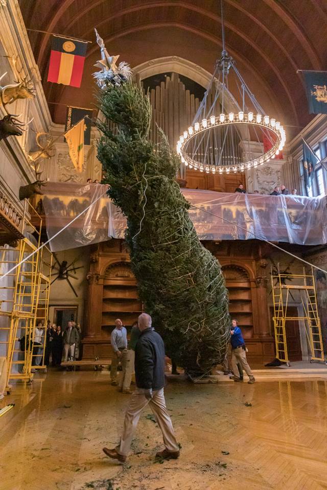 The 35-foot tree is Christmas at Biltmore’s star attraction each year. Santa Claus rode aboard a horse-drawn carriage to usher the tree to the front door of Biltmore House. It took more than 40 staff members to hoist the tree onto their shoulders and carry it into the Banquet Hall, where a system of ropes secured the tree in place.
