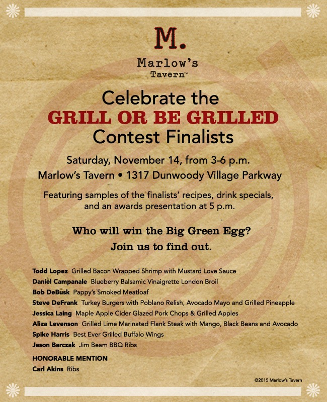Join Marlow’s for a Big Green Egg Grilling Party November 11, 2015This weekend. Stop by, meet the contest finalist and try some of their delicious creations. Previous: Customer Appreciation Days at Strippaggio ($5 off $25 Coupon)Next: Veterans Day Golf Deals